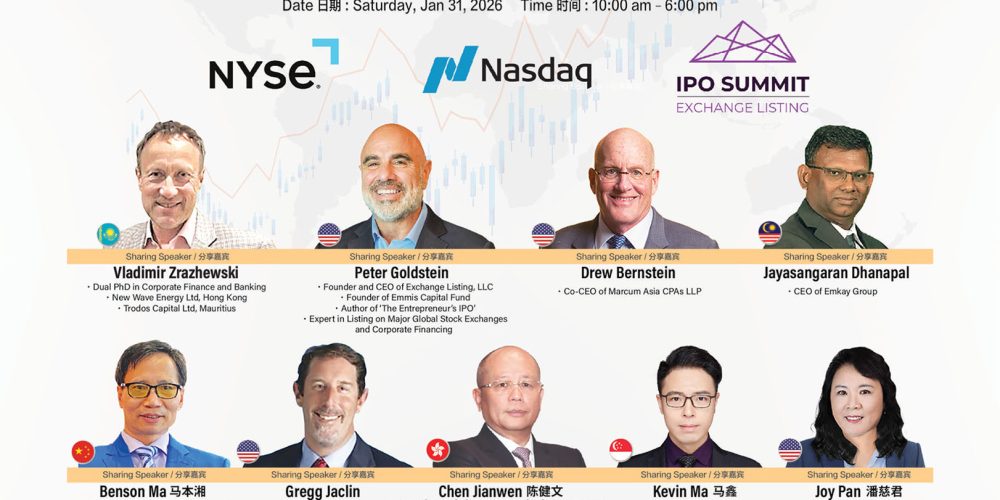在全球资本市场波动加剧、监管环境日趋复杂的大环境下,一场聚焦企业国际上市路径的高规格财经盛会——“IPO Summit:The Roadmap to a Successful Listing in a Challenging Market(IPO 峰会:在充满挑战的市场中迈向成功上市的路线图)”,将于2026年1月31日(星期六)上午10时至下午6时,在雪州八打灵再也 Neo Damansara 的 Mercu Mustapha Kamal Tower 2 隆重举行。 本次峰会汇聚来自日本、中国、香港、台湾、泰国、印尼、马来西亚、新加坡、美国、欧洲、中亚及东欧等多个国家与地区的投资人、金融专家、专业机构代表及企业家,是一场极具国际视野的高端财经交流平台。大会将围绕企业赴美及其他国际资本市场上市的最新趋势、实务操作、合规监管与投资机遇展开深入探讨,协助企业在充满挑战的市场环境中,系统性规划IPO路线图。 聚焦国际上市实务 深入解析纳斯达克核心要点 随着国际资本市场持续开放与加速融合,亚太企业,尤其是中国及区域企业赴美上市,已成为企业国际化发展的重要战略选择。然而,上市过程中所面对的合规要求、信息披露标准、审计规范及市场波动风险亦日益复杂。 本次IPO峰会正是希望为企业提供更清晰、更稳健、更具可执行性的上市路径。大会将搭建一个务实、高效的专业交流平台,协助企业打通中美资本市场的关键环节,为国际化发展奠定坚实基础。 专家指出,企业在筹划上市时,应从投资者关系与长期战略布局角度出发,尽早与投资银行建立联系并启动审计工作,通常在120至150天内取得初步反馈,整体上市流程有机会在约一年内完成。大会期间,专家小组亦将针对最新美国上市规则变化,尤其是涉及中国、香港及澳门企业的新要求进行深入解读。 重量级主讲嘉宾云集 全方位分享跨境资本智慧 本次峰会主讲嘉宾阵容鼎盛,涵盖金融、会计、法律、投资、房地产、科技及跨境资本运作等多个领域的国际级重量人物: 李冠群(Davey Lee)国际资产规划师协会主席 李冠群先生长期深耕国际资产配置、跨境资本规划与财富管理领域,对全球资本市场结构及趋势具有深刻洞察。他积极协助亚太企业在复杂的国际监管环境中制定稳健的上市与资本发展策略,是推动区域企业走向国际资本市场的重要推动者。 陈学萩(Veronica Tang)大橙传媒集团首席执行官 陈学萩女士 […]