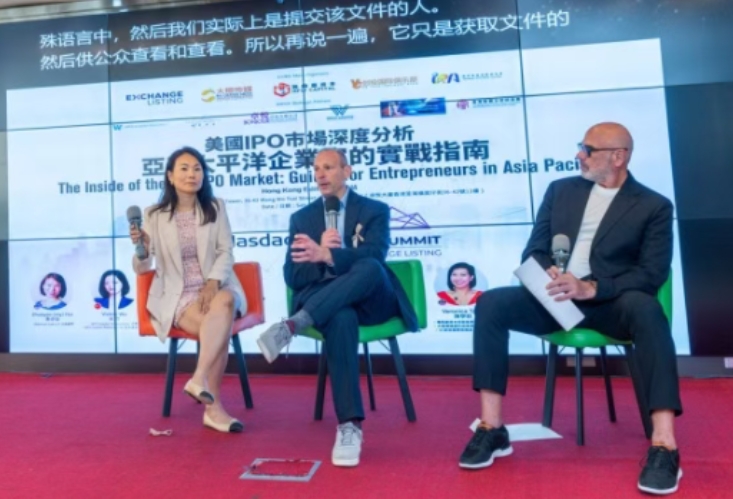 图说:Robinson Cole LLP法律顾问惠卓瑶(图左)、Edgar Agents, LLC 销售董事Brian Cavalli(图中)、Exchange Listing, LLC创始人兼CEO Peter Goldstein(图右)深入探讨了美国IPO市场的最新趋势