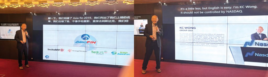 AsiaFIN Holdings Corp.创办人兼集团总裁黃启祥(Wong Kai Cheong (KC))也上台分享他的项目。 AsiaFIN Holdings Corp.是一家在美国OTC QB市场上市的金融科技公司,总部设于马来西亚吉隆坡,专注于在东盟地区提供创新的金融处理解决方案。
