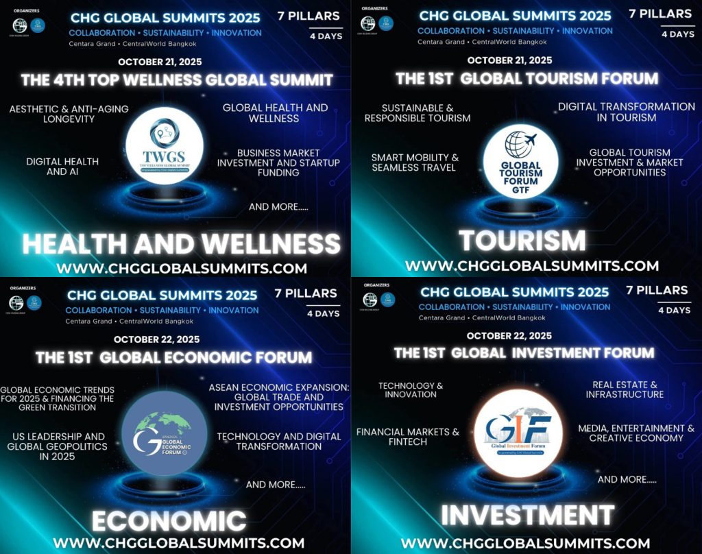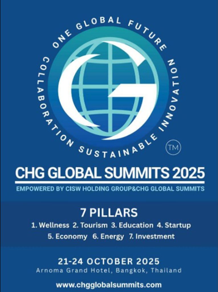 2025年10月21日至24日,世界的目光将聚焦曼谷!以“连接思想,赋能国家”(Connecting Ideas, Empowering Nations)为主题的2025年CHG全球峰会(CHG Global Summits 2025)将在曼谷著名的Arnoma Grand Hotel盛大举办,预计吸引来自100个国家超过200位全球领袖、创新者、政策制定者与企业家齐聚一堂,共同探讨合作、可持续与创新的未来。