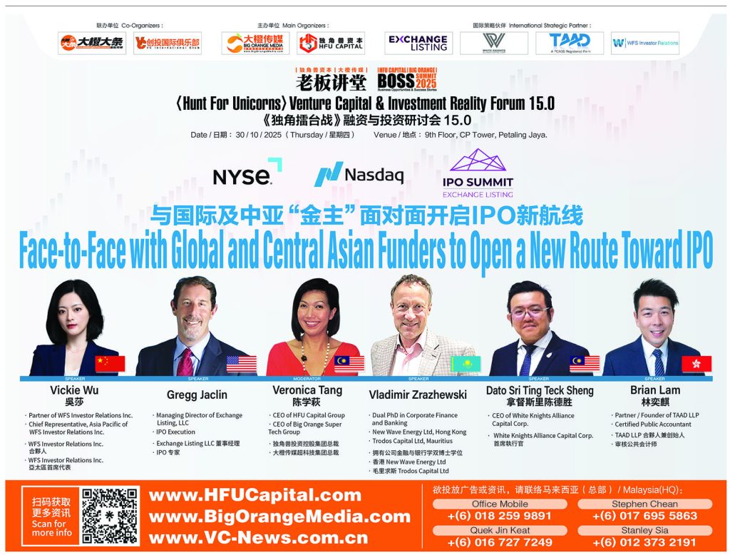 由大橙传媒集团(Big Orange Media Group)与独角兽资本集团(HFU Capital Group)联合主办的 《HUNT FOR UNICORNS》 Fundraising & Investment Miniforum 15.0《独角擂台战》融资与投资研讨会15.0于2025年10月30日(星期四)在雪兰莪八打灵再也CP Tower九楼盛大举行。