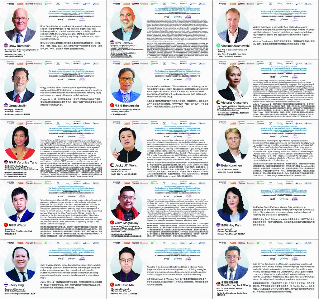 此外,来自东欧的投资者 Vladimir Zrazhewski 将分享东欧资本市场关注的投资领域与项目方向;Marcum Asia 高级合伙人潘慈君(Joy Pan) 及 执行董事兼新加坡办公室负责人马鑫(Kevin Ma),亦将从会计、税务与合规角度,分享企业赴美上市的关键专业意见。
