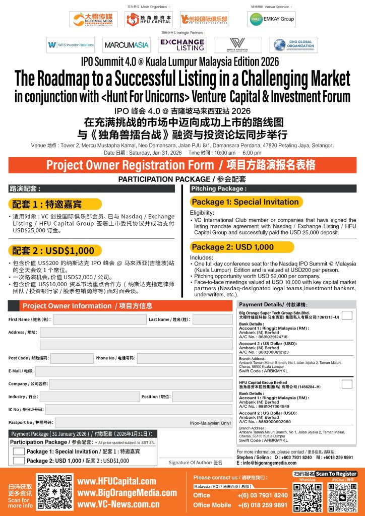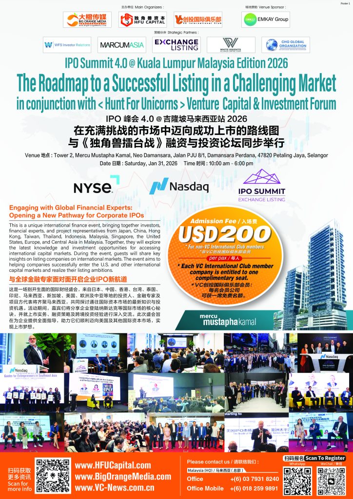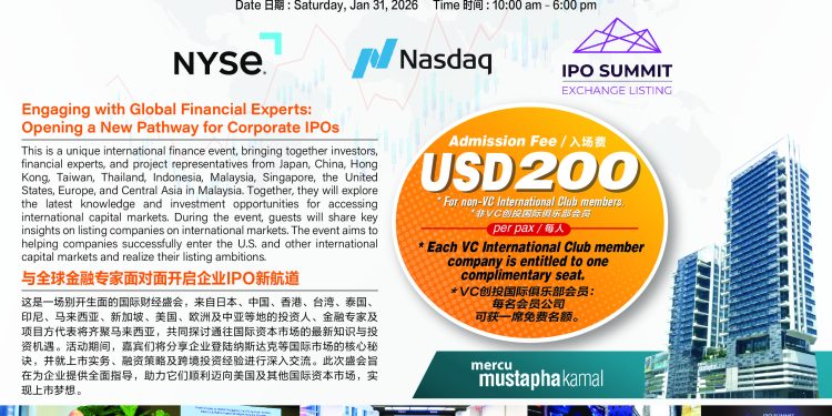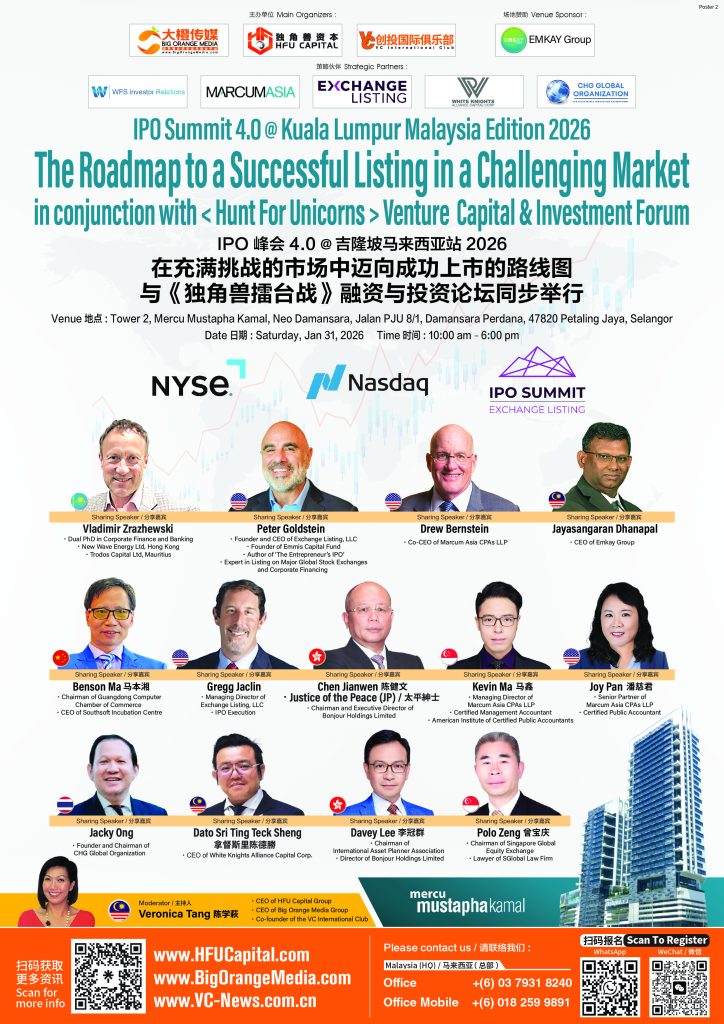 Amid heightened volatility in global capital markets and an increasingly complex regulatory environment, a high-level financial summit focusing on corporate international listing pathways — “IPO Summit 4.0@Kuala Lumpur 2026: The Roadmap to a Successful Listing in a Challenging Market” — will be held on January 31, 2026 (Saturday), from 10:00 a.m. to 6:00 p.m., at Mercu Mustapha Kamal Tower 2, Neo Damansara, Petaling Jaya, Selangor.